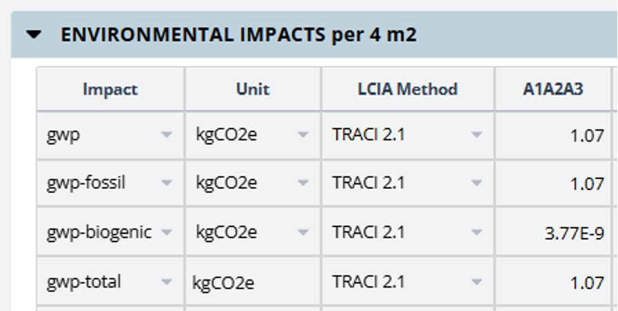 - Distinguish between GWP-fossil, GWP-biogenic, GWP-luluc, and GWP-total, GWP Including Biogenic, GWP Excluding Biogenic, and handle EPDs that just say “GWP” without clarifying, in addition to other impact indicators like acidification, eutrophication and all their variants